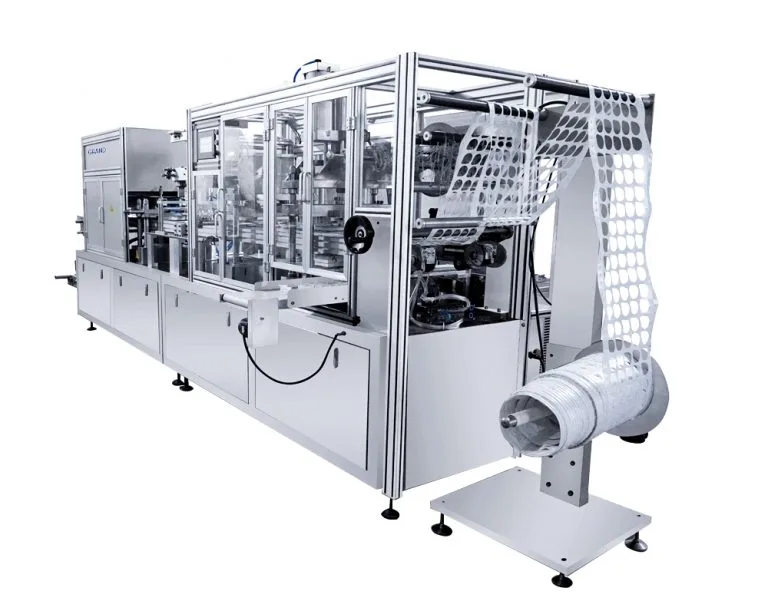 Подающая станция вкладывает фасуемые предметы в ячейковые карманы, закрывает верхней защитной подложкой, выполняет тиснение, запечатывание, перфорацию. Штамповочный механизм делит блистерное полотно на отдельные карты. Цикл под управлением ПЛК не дает сбоев, обеспечивает высокое качество упаковки.