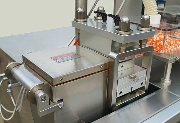Запечатывающее устройство сочетает преимущества пневматики и гидравлики, позволяет регулировать давление. При остановке линии, плановой/аварийной, термосваривающая форма поднимается автоматически, что исключает попадание в блистерные ячейки горячего воздуха.