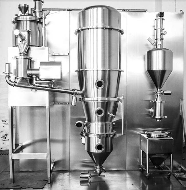 Грануляция в псевдоожиженном слое объединяет две технологии в одну. Порошок в рабочей камере находится со взвешенном состоянии, подгоняемый потоком нагретого воздуха. Одновременно через форсунки распыляется связующая жидкость. Гранулы образуются и высыхают в свободном парении, без дополнительной процедуры сушки.