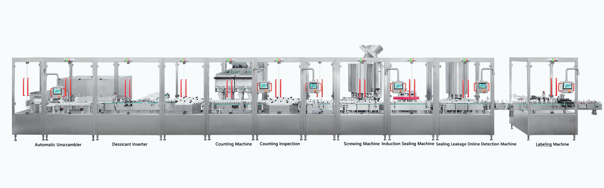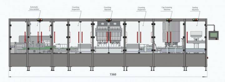 Оборудование модульной конструкции. С интегрированными блоками Unscrambler, Counting, Double Validation Function для подсчета и заполнения, а также Capping и Sealing Machine. Длина технологической линии составляет 6 метров. Это примерно вдвое короче стандартных счетных устройств и предоставляет значительную экономию рабочего пространства.